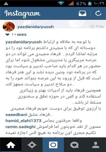 داریوش یزدانی همبازی سابق فرهاد مجیدی در استقلال آخرین نفری است که نسبت به برخی از اظهارات فرهاد مجیدی در این برنامه واکنش نشان داده است. او در اینستاگرام خودش چنین متنی را نوشته است: