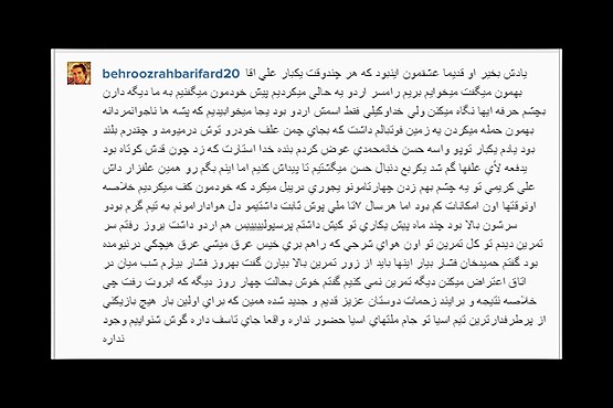 چند ماه پیش یه کاری تو کیش داشتم پرسپولیس هم اردو داشت یک روز رفتم سر تمرین دیدم تو کل تمرین تو اون هوای شرجی که راهم بری خیس عرق میشی عرق هیچکی درنیومده بود گفتم حمیدخان فشار بیار اینها باید از زور تمرین بالا بیارن گفت بهروز فشار بیارم شب میان در اتاق اعتراض میکنن دیگه تمرین نمی کنیم! گفتم: خوش بحالت چهار روز دیگه که آبروت رفت چی؟ خلاصه نتیجه و برایند زحمات دوستان عزیز قدیم و جدید شده همین که برای اولین بار هیچ بازیکنی از پرطرفدارترین تیم آسیا تو جام ملتهای آسیا حضور نداره واقعا جای تاسف داره گوش شنواییم وجود نداره»