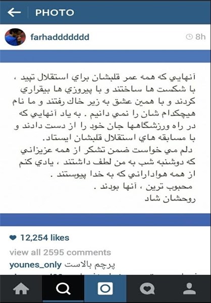 فرهاد مجیدی که شب گذشته در برنامه 90 به عنوان محبوب ترین بازیکن استقلال انتخاب شد با انتشار پیامی در اینستاگرام نوشت: آنهایی که همه عمر قلبشان برای استقلال تپید، با شکستها ساختند و با پیروزی ها بیقراری کردند و با همین عشق به زیر خاک رفتند و ما نام هیچکدام شان را نمیدانیم. به یاد آنهایی که در راه ورزشگاهها جان خود را از دست دادند و با مسابقه های استقلال قلبشان ایستاد. دلم میخواست ضمن تشکر از همه عزیزانی که دوشنبه شب به من لطف داشتند، یادی کنم از همه هوادارانی که به خدا پیوستند. محبوب ترین آنها بودند. روحشان شاد.