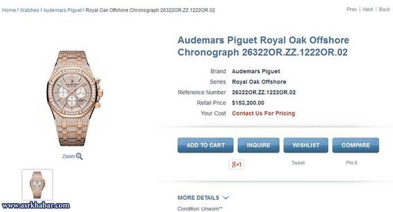 با بررسی تصویر اصلی ساعت لوکس این سرمایه دار ایرانی مشخص می شود که مارک ساعت وی(price audemars piguet) می باشد که با بررسی مدل های مختلف این ساعت و یافتن مدل مورد نظر و جستجوی ساده اینترنتی در دنیای مجازی میتوان قیمت حدودی را برای این ساعت به طور متوسط 150 هزار دلار (بند فلزی) در نظر گرفت که با قیمت امروز دلار به ارزش 3200 تومان، می توان گفت فقط ساعت این سرمایه دار ایرانی 480 میلیون تومان ارزش دارد.