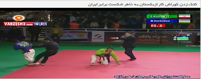در حالی که شرکت کننده کشورمان مشغول خوشحالی بود به ناگاه یک نفر از میان تماشاگران که متوجه برد نماینده کشورمان نشده بود به درون تاتامی دوید، شرکت کننده ازبک را به باد کتک گرفت و با چند لگد او را نقش بر زمین کرد.