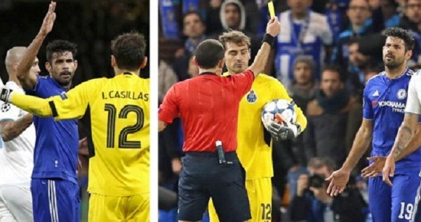 در جریان دیدار دو تیم چلسی و پورتو در دور ششم و پایانی مرحله گروهی لیگ قهرمانان اروپا، درگیری مختصری میان دیگو کاستا و ایکر کاسیاس، دو بازیکن اسپانیایی حاضر در زمین رخ داد. این برخورد زمانی ایجاد شد که کاسیاس توپی بلند را مهار کرد و مهاجم آبی پوشان نتوانست کاری را انجام دهد. اما کاستا به عمد خودش را به ایکر کاسیاس کوبید و روی زمین افتاد تا خشم دروازه بان افسانه ای پورتو را به همراه داشته باشد. این در حالی بود که توپ در جریان بازی نبود.
