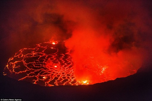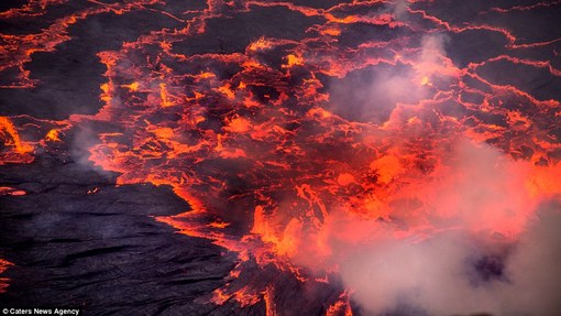 محققانی که در حال پرواز دادن پهبادی بودند آن را از بالای بزرگترین دریاچۀ مواد مذاب آتشفشان نیراگونگوست.