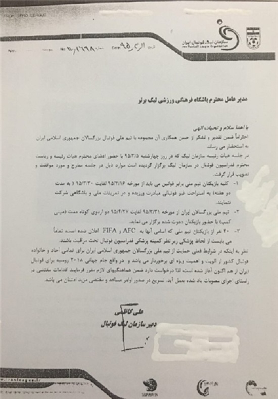 در این نامه که به امضای دبیر لیگ فوتبال رسیده درخواستی عجیب از باشگاه‌ها مطرح شد و مبنی بر اینکه کلیه بازیکنان تیم ملی باید از تاریخ 16 خرداد 95 لغایت 30 خرداد 95 به مدت دو هفته به استراحت غیرفوتبالی بروند و در تمرینات تیم‌های ملی و باشگاهی شرکت نکنند!