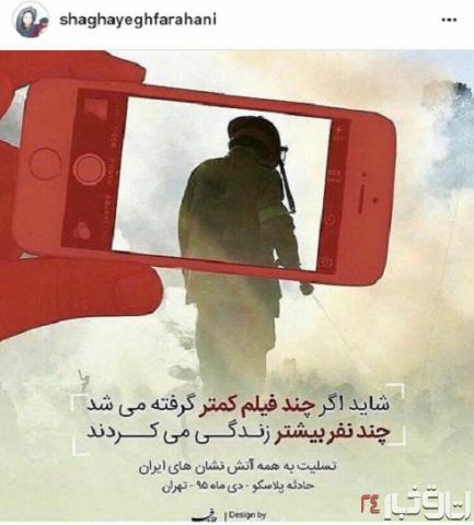 شقایق فراهانی بازیگر سینمای و تلویزیون ایران به حادثه پلاسکو واکنش نشان داد.در پستی در صفحه ی شخصی خود ضمن اظهار تاسف واندوه نسبت به حادثه پلاسکو به تجمع مردم عادی در اطراف ساختمان پلاسکو پس از بروز حادثه و اختلالاتی که بر اثر ازدحام جمعیت پیش آمد واکنش نشان داد.
