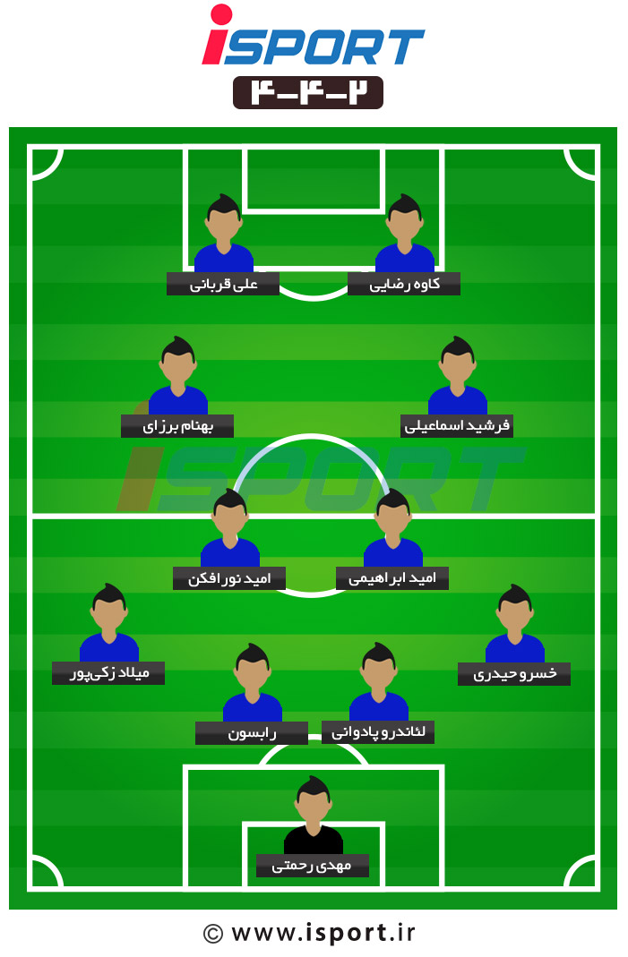 به گزارش ورزش نویس، خسرو حیدری، به خط دفاع برگشته و فرشید اسماعیلی و بهنام برزای، پشت سر کاوه و قربانی قرار دارند.
