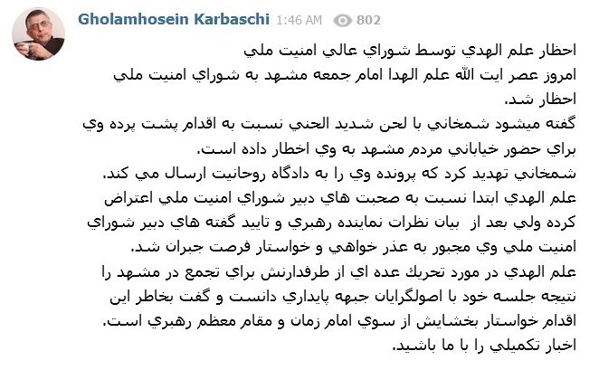 به گزارش تسنیم، غلامحسین کرباسچی دبیرکل حزب کارگزاران سازندگی طی مطلبی که شخصاً به برخی گروههای تلگرامی ارسال کرده ادعا کرده است که شورای عالی امنیت ملی، آیت الله علم الهدی را به دلیل "اقدام پشت پرده او در تجمعات خیابانی مشهد" فراخوانده و "شمخانی(دبیر شورای عالی امنیت ملی) شخصاً با لحن شدید به او تذکر داده است"