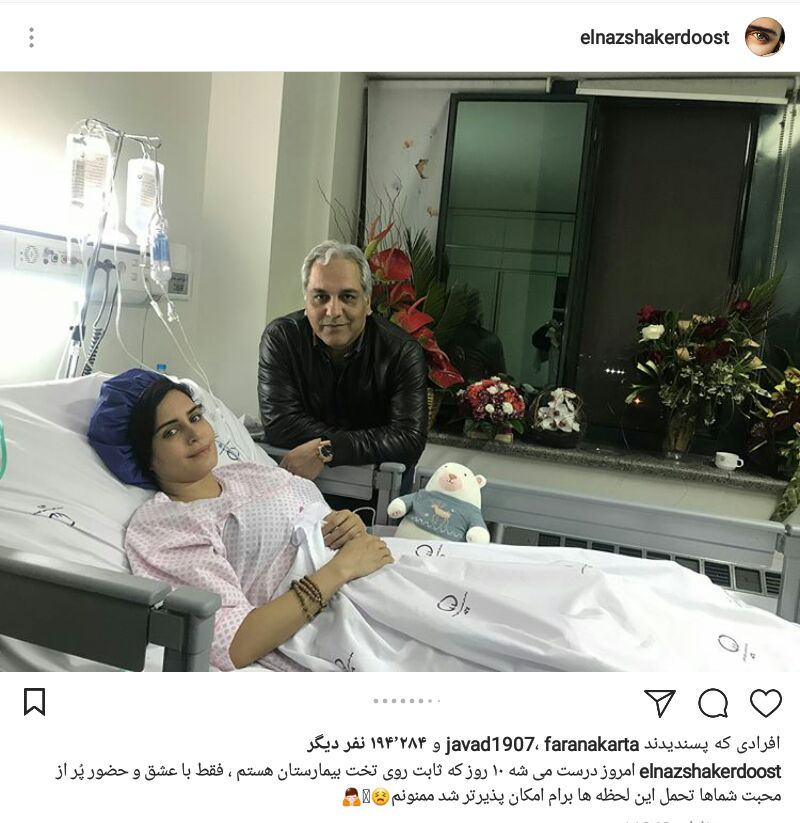 روزنو :سایت سینما سینما: الناز شاکر دوست مدتی است به دلیل بروز حادثه در حین ظبط کار جدیدش در بیمارستان بستری است.مهران مدیری به همین دلیل از این بازیگر عیادت کرده است.