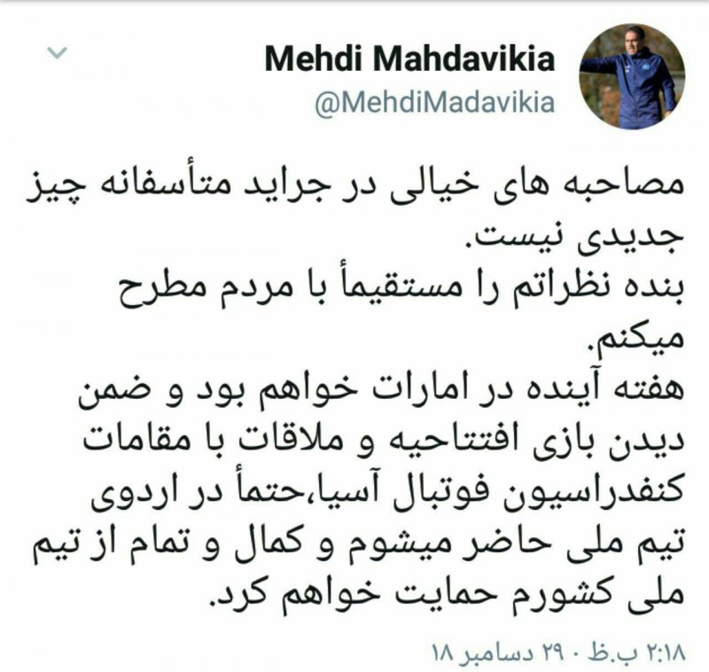 مهدوی کیا ضمن تکذیب مصاحبه ای که به نقل از او اعلام شده بود، او به درخواست کی روش نمی رود و به این خاطر می رود که کنفدراسیون فوتبال آسیا از او دعوت به عمل آورده، اینگونه واکنش نشان داده است : « مصاحبه های خیالی در جراید متاسفانه چیز جدیدی نیست ! بنده نظراتم را مستقیما با مردم مطرح می کنم. هفته آینده در امارات خواهم بود و ضمن دیدن بازی افتتاحیه و ملاقات با مقامات کنفدراسیون فوتبال آسیا، حتما در اردوی تیم ملی حاضر می شوم و تمام و کمال از تیم ملی کشورم حمایت می کنم.»