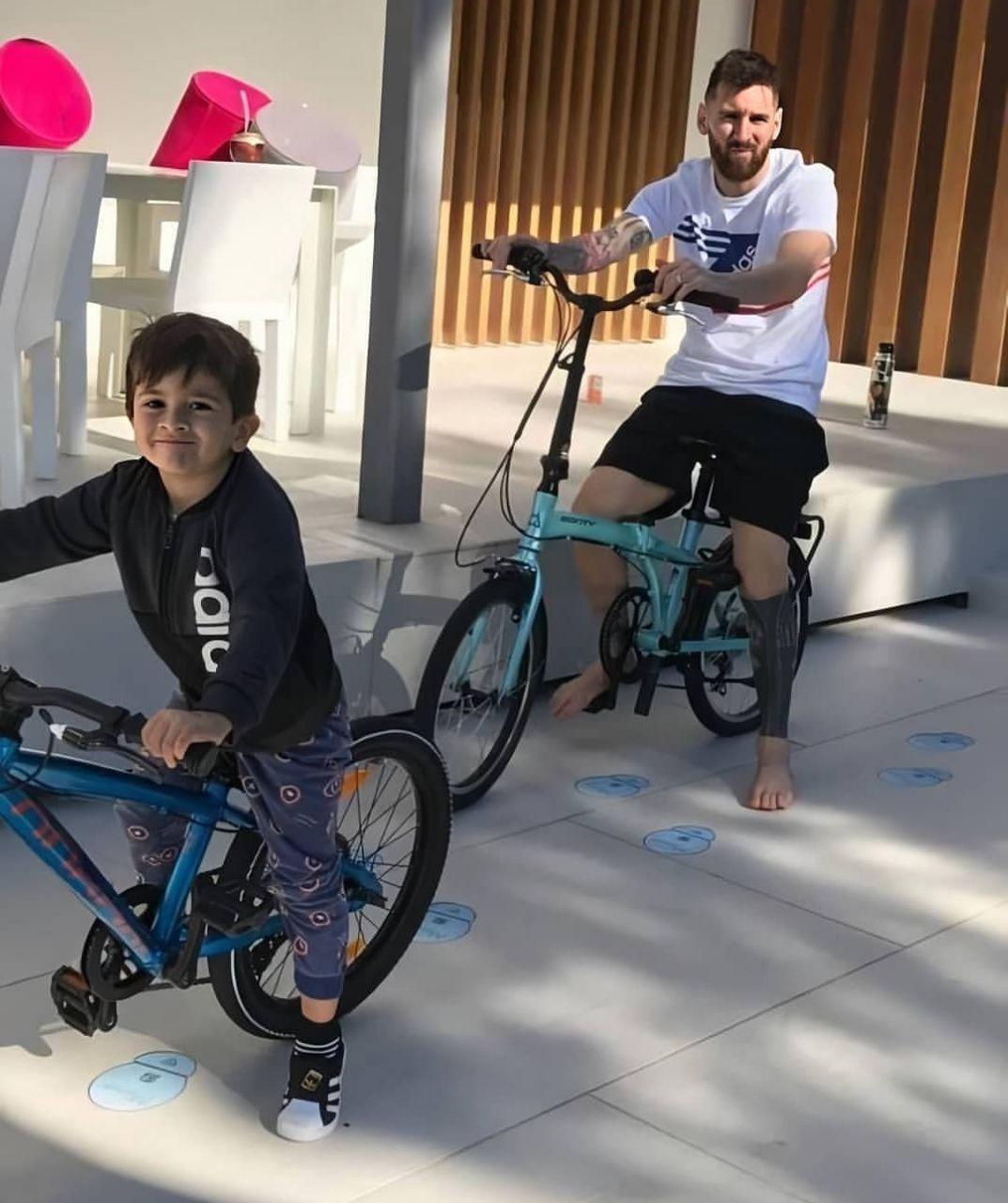 لیونل مسی و فرزندش تیاگو  در روزهای قرنطینه در حال دوچرخه سواری.