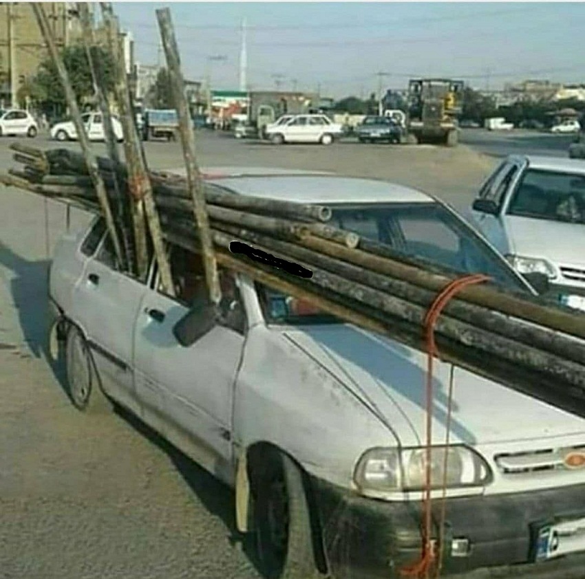 در عکس زیر می بینید که راننده این پراید به شکلی بسیار عجیب تعدادی لوله فلزی را با این خودرو که در شرایط عادی هم نا ایمن و نا مظمئن است حمل می کند. با این کار جان راننده و دیگران به خطر خواهد افتاد.
