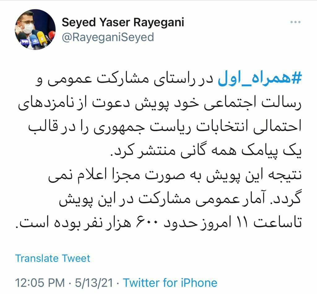 توئیت مدیرکل ارتباطات همراه اول در خصوص پویش دعوت از نامزدهای احتمالی انتخابات ریاستجمهوری منتشر شد.