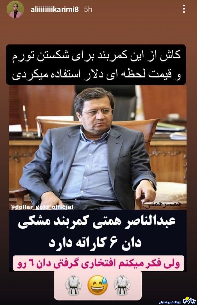 علی کریمی در واکنش به ادعایی که درباره ورزشکار بودن عبدالناصر همتی رئیس سابق بانک مرکزی و کاندیدای رئیس جمهوری، یک استوری در صفحه اینستاگرامش منتشر کرد.