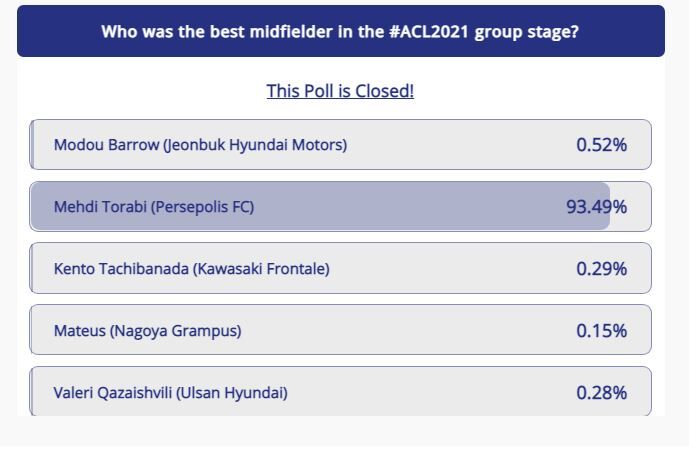 سایت کنفدراسیون فوتبال آسیا (AFC) یک هفته پیش یک نظرسنجی را برای انتخاب بهترین هافبک مرحله گروهی لیگ قهرمانان آسیا ۲۰۲۱ برگزار کرد.