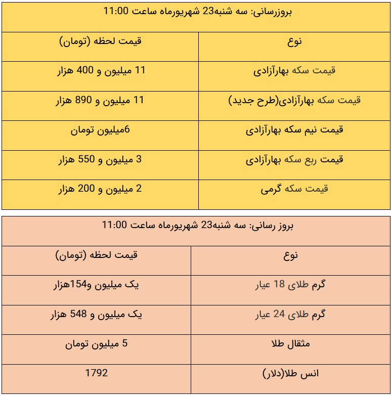 قیمت طلا و سکه، امروز ۲۳ شهریور ۱۴۰۰