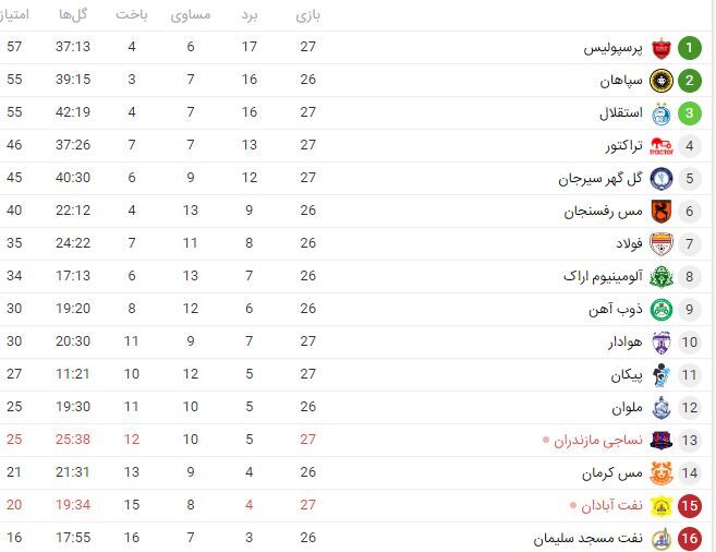 جدول لیگ برتر پس از برد پرسپولیس مقابل استقلال