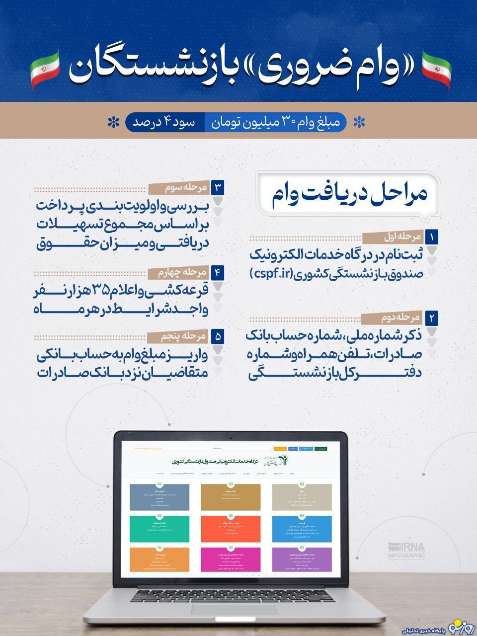 مراحل پنجگانه دریافت «وام ضروری بازنشستگان» با سود ۴ درصد و مبلغ ۳۰ میلیون تومان را در اینفوگرافیک مشاهده کنید.
