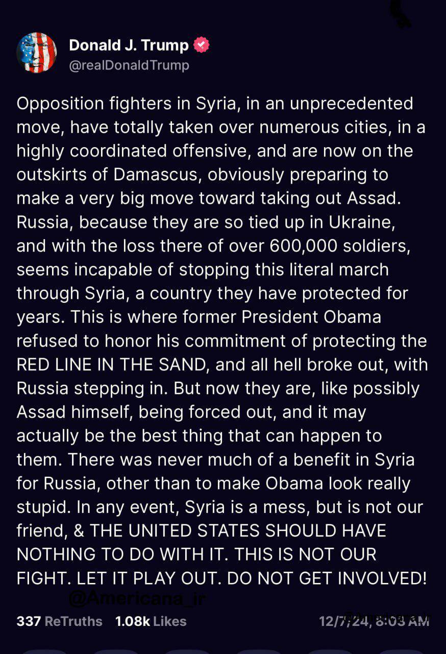 و نوشت: «مبارزان مخالف در سوریه با حرکتی بیسابقه، کنترل کامل چندین شهر را به دست گرفتهاند و در یک حمله گسترده اکنون به حومه دمشق رسیدهاند و بهوضوح برای اقدامی بزرگ علیه اسد آماده میشوند. روسیه، به دلیل درگیریهای سنگین در اوکراین و از دست دادن بیش از ۶۰۰،۰۰۰ سرباز در آنجا، توانایی جلوگیری از این پیشروی واقعی در سوریه، کشوری که سالها از آن حمایت کرده، را ندارد ... سوریه بههم ریخته است و دوست ما نیست. ایالات متحده نباید هیچگونه دخالتی در این موضوع داشته باشد. این نبرد ما نیست. بگذارید اوضاع به حال خود پیش برود. درگیر نشوید!»