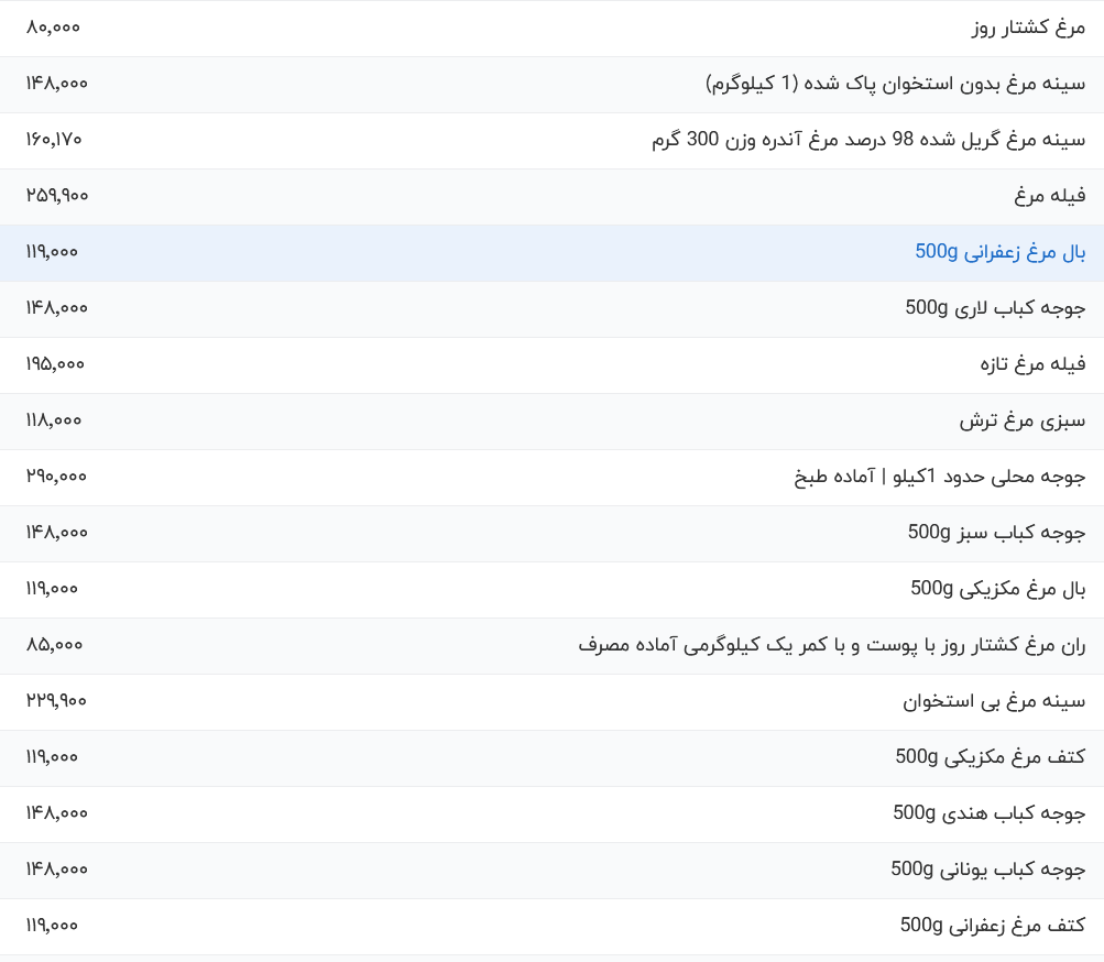 قیمت گوشت مرغ، امروز ۱ اردیبهشت ۱۴۰۴ شامل ران مرغ، مرغ زنده، مرغ بدون استخوان، فیله مرغ، پا مرغ، مرغ کشتار روز، ران مرغ با پوست، مرغ ترش و مرغ سبز اعلام شد.