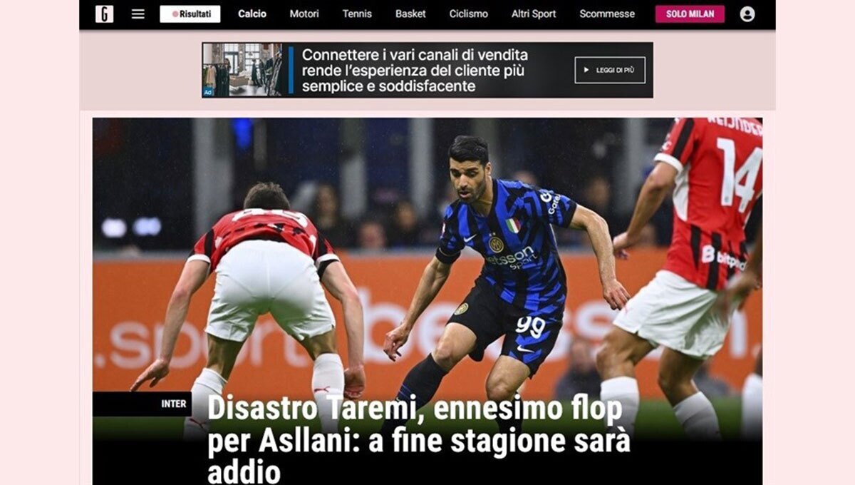 در این میان نشریه گاتزتادلواسپورت از نمایش چهارشنبه شب اینتریها برابر میلان به عنوان «بدترین 90 دقیقه فصل» یاد کرده است. نشریه چاپ میلان اما در میان بازیکنان اینتر از دو نفر بیشتر انتقاد کرده که یکی از آنها طارمی است و دیگری اصلانی. «نشریه صورتی» از این دو نفر به عنوان بازیکنانی فاقد ثبات در تأثیرگذاری در مدت حضورشان در سنسیرو یاد میکند و تا جایی عملکرد آنها را زیر سؤال برده که به سران باشگاه اینتر توصیه کرده در پنجره تابستانی پیشرو هر دو بازیکن را بفروشد.