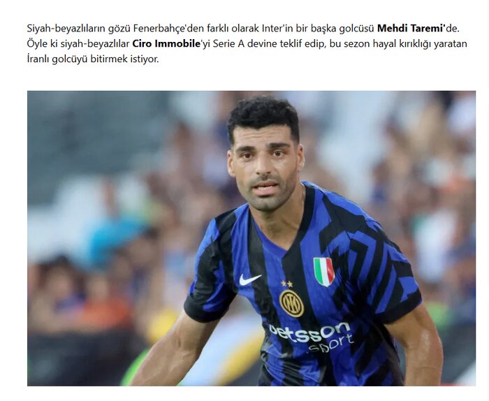 برخلاف فنرباغچه، چشم سیاه و سفیدها به دیگر مهاجم اینتر، مهدی طارمی، دوخته شده است. بشیکتاش به قدری به طارمی علاقهمند است که میخواهد چیرو ایموبیله را به غول سریآ پیشنهاد دهد تا آنها را از دست مهاجم ایرانی که در این فصل ناامیدکننده بوده، خلاص کند.