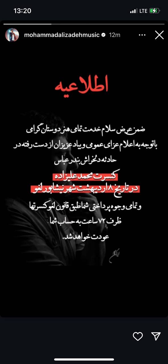 برترینها: محمد علیزاده، در پی اعلام عزای عمومی برای حادثه اندوهناک بندرعباس، از لغو شدن کنسرتش خبر داد.
