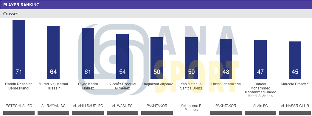 بر اساس اعلام AFC، رامین رضاییان با ارسال ۷۱ سانتر در صدر جدول بیشترین ارسال سانتر بالاتر از بازیکنانی چون ریاض محرز و بروزوویچ قرار دارد. اختلاف رضاییان با نفر دوم این لیست ۷ سانتر است و این در حالیست که استقلال در مرحله یک هشتم نهایی لیگ نخبگان آسیا از این رقابتها کنار رفته است.