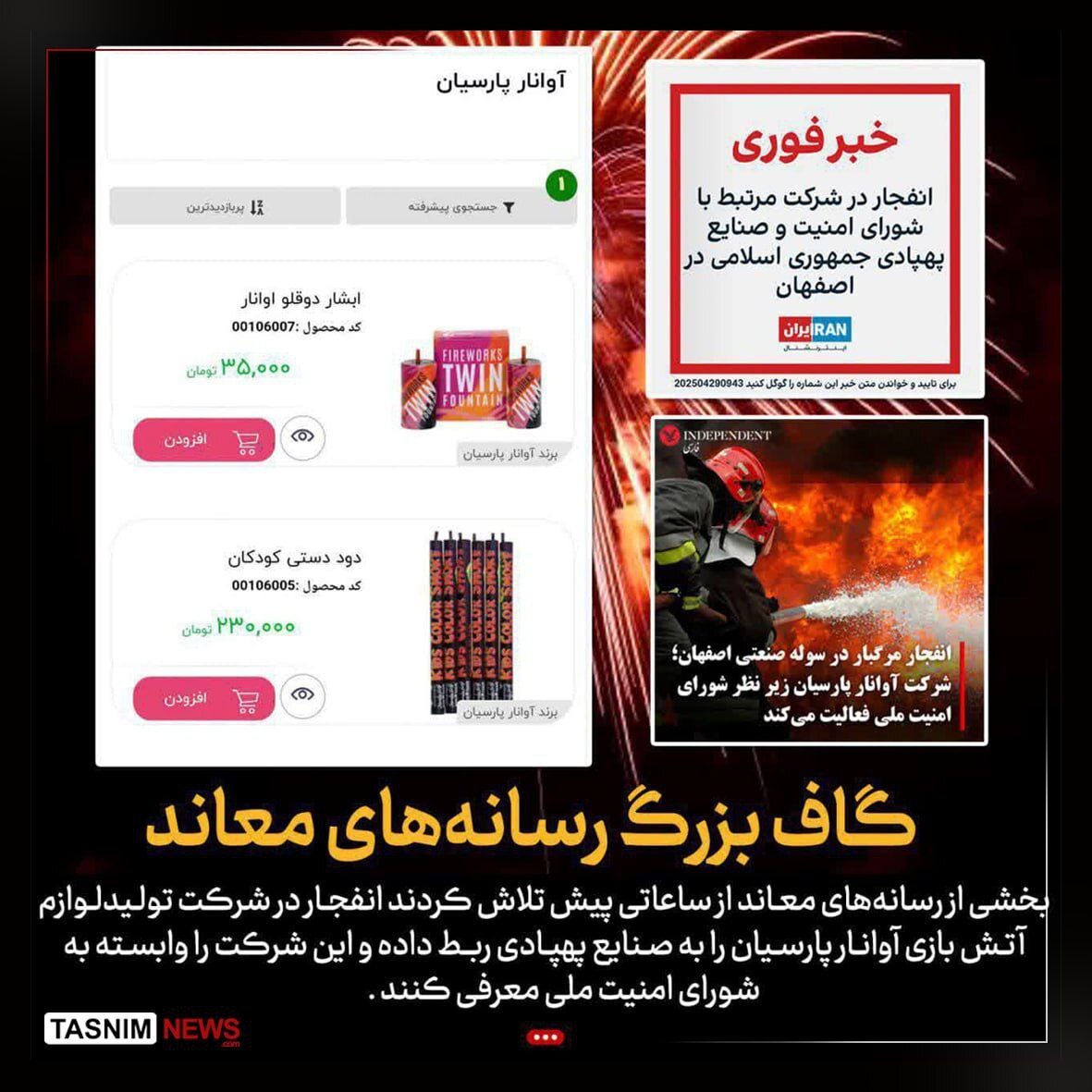 خبرگزاری تسنیم نوشت: بخشی از رسانههای ضدایرانی تلاش کردند انفجار در شرکت تولید لوازم آتش بازی آوانار پارسیان را به صنایع پهپادی ربط داده و این شرکت را وابسته به شورای امنیت ملی معرفی کنند.