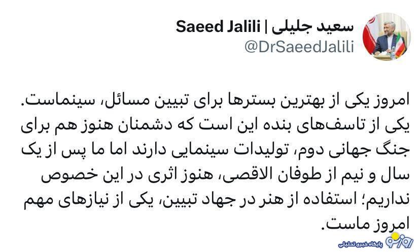 سعید جلیلی در توئیتی نوشت: یکی از تاسف های بنده این است که دشمنان هنوز هم برای جنگ جهانی دوم تولیدات سینمایی دارند اما ما هیچ اثری از طوفان الاقصی نداریم.