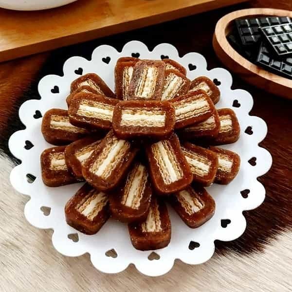 اگر میخواهید خرما ویفری که درست میکنید طعم و مزه خاصی بدهد میتوانید از ویفرهای با طعمهای شکلاتی، موزی، پرتقالی، نارگیلی و توت فرنگی یا هر طعمی به دلخواه و سلیقه خودتان استفاده کنید و روی خرما قرار دهید و سپس رول کنید.