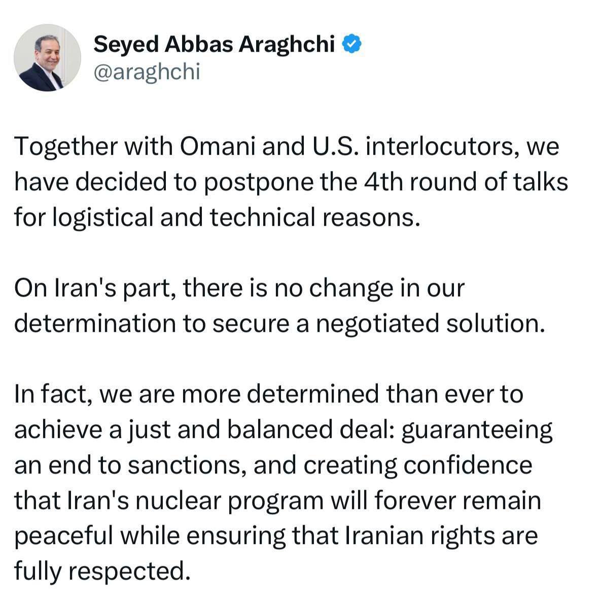 بههمراه طرف های عمانی و آمریکایی، تصمیم گرفتیم دور چهارم گفتوگوها را به دلایل لجستیکی و فنی به تعویق بیندازیم.