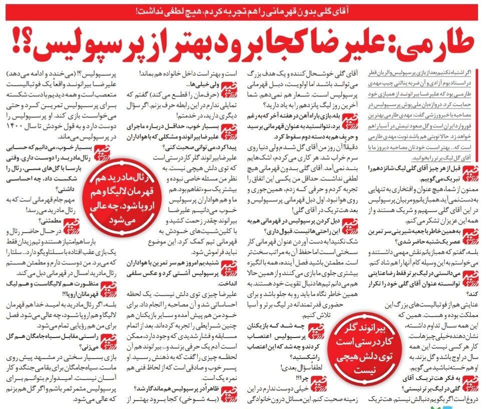 - علیرضا بیرانوند یک دروازهبان کاردرست است که توی دلش هیچی نیست. اتفاقی که در مورد او و هواداران پرسپولیس به وقوع پیوست از نظر من مساله خاصی نبوده و بیشتر یک سوء تفاهم بود ( اشاره طارمی به اتفاقاتی است که در مقطعی از لیگ شانزدهم میان بیرانوند و گروهی از هواداران پرسپولیس رخ داد و موجب ناراحتی آنها از حرفهای بیرانوند شد ) هواداران پرسپولیس و خود ما میدانیم علیرضا چقدر زحمت کشید و با کلین شیتهای خود به قهرمانی پرسپولیس کمک کرد. او چیزی توی دلش نیست. البته یک لحظه احساساتی شد و مصاحبهای انجام داد که... همانطور که گفتم، نباید زحماتی که بیرانوند برای پرسپولیس کشیده را فراموش کرد. یادمان نرود علیرضا یک فوتبالیست متعصب است و همه دیدیم حتی با دست شکسته با پرسپولیس تمرین کرد. او با پرسپولیس قرارداد دارد و می ماند. اصلا کجا برود بهتر از پرسپولیس؟