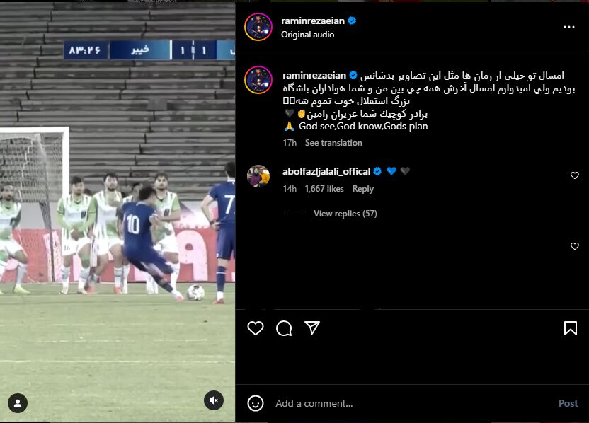 «امسال تو خیلی از زمانها مثل این تصاویر بدشانس بودیم ولی امیدوارم امسال آخرش همه چی بین من و شما هواداران باشگاه بزرگ استقلال خوب تموم شه. برادر کوچیک شما عزیزان رامین»