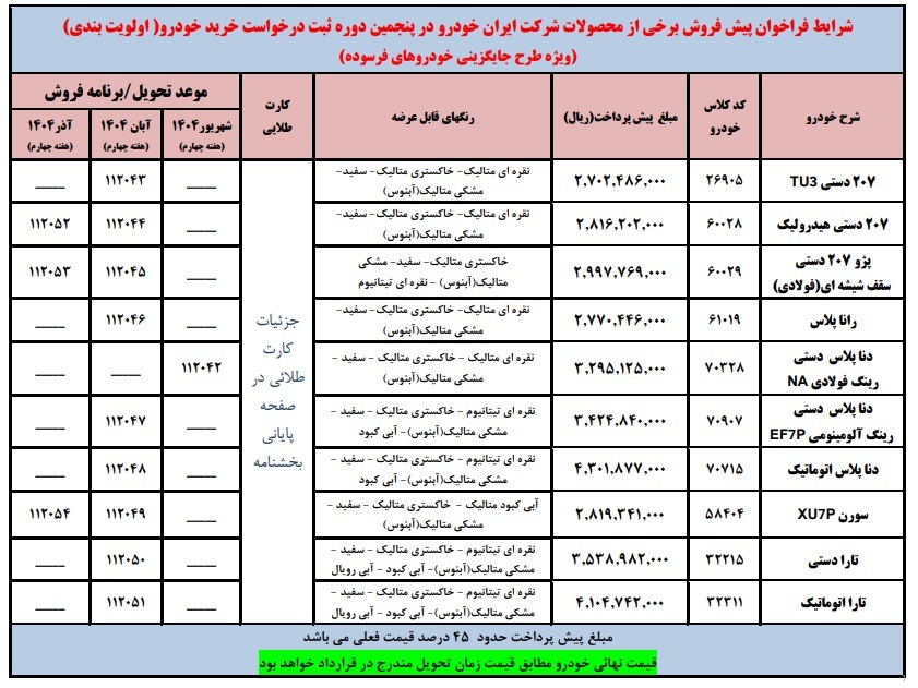 به گزارش جماران؛ قابل توجه متقاضیان واجد شرایط تبصره 5 از ماده 10 قانون ساماندهی صنعت خودرو و ماده 11 آئین نامه اجرایی طرح جایگزینی خودروهای فرسوده که در پنجمین دوره ثبت درخواست خرید (اولویت بندی) برخی محصولات ایران خودرو در فروردین ماه سال 1404 در سایت ثبت درخواست خرید محصولات ایران خودرو ثبت نام نموده و متعاقباً در لیست انتظار خودرو قرار گرفته اند، می رساند این شرکت به استناد بندهای 8 و 9 بخش تذکرات مهم اطلاعیه پنجمین دوره ثبت درخواست خرید خودرو در شرکت ایران خودرو منتشر شده در سامانه مذکور درصدد فراخوان پیش فروش خودرو با اولویت فروش و عقد قرارداد به متقاضیان مشمول این فراخوان بر اساس شرایط ذیل می باشد. جدول مربوط به شرایط پیش فروش اعم از نوع خودرو ، موعد تحویل ، برنامه فروش و قیمت به شرح ذیل اعلام می گردد: