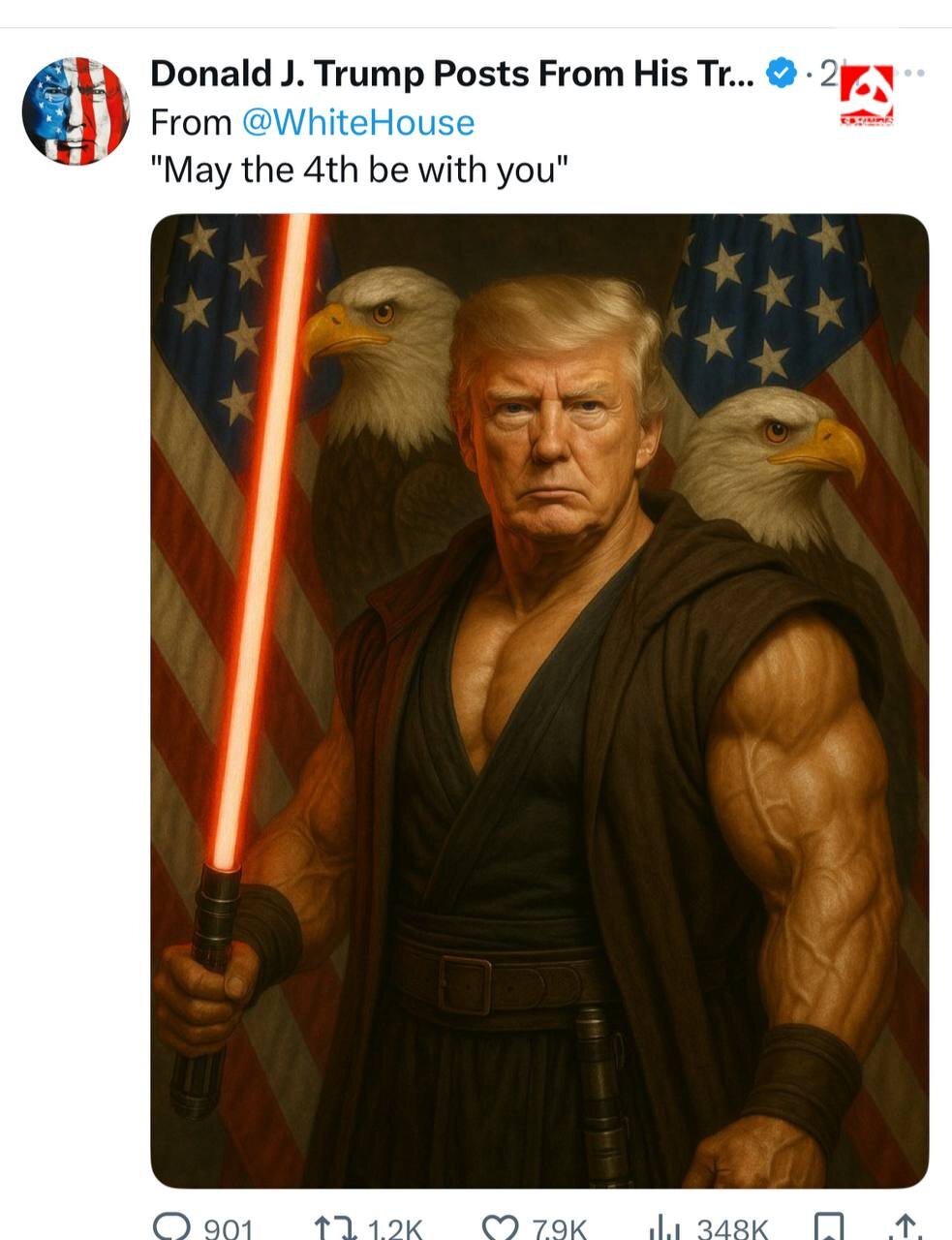 روزنو :دونالد ترامپ در شبکه اجتماعی ایکس بهمناسبت روز جهانی «جنگ ستارگان»، تصویری از خودش را با ظاهری متفاوت که یادآور این سریال مشهور است، منتشر کرده است.