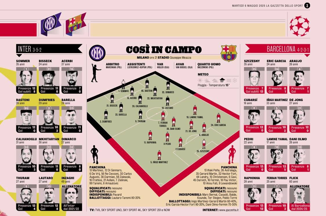 پس از تساوی هیجانانگیز ۳-۳ در بازی رفت مرحله نیمهنهایی لیگ قهرمانان اروپا در اسپانیا، امشب اینتر میلان در ورزشگاه خانگی خود، جوزپه مهآتزا (سن سیرو)، میزبان بارسلونا است. این دیدار، نبردی تمامعیار برای رسیدن به فینال معتبرترین تورنمنت باشگاهی اروپاست و نگاهها به تصمیمات تاکتیکی سیمونه اینزاگی و هانسی فلیک، سرمربیان دو تیم، برای چینش ترکیب اصلی دوخته شده است. روزنامه معتبر گاتزتا دلو اسپورت ایتالیا، طبق روال خود، ترکیب احتمالی دو تیم را پیشبینی کرده که حاوی نکات جالبی است.