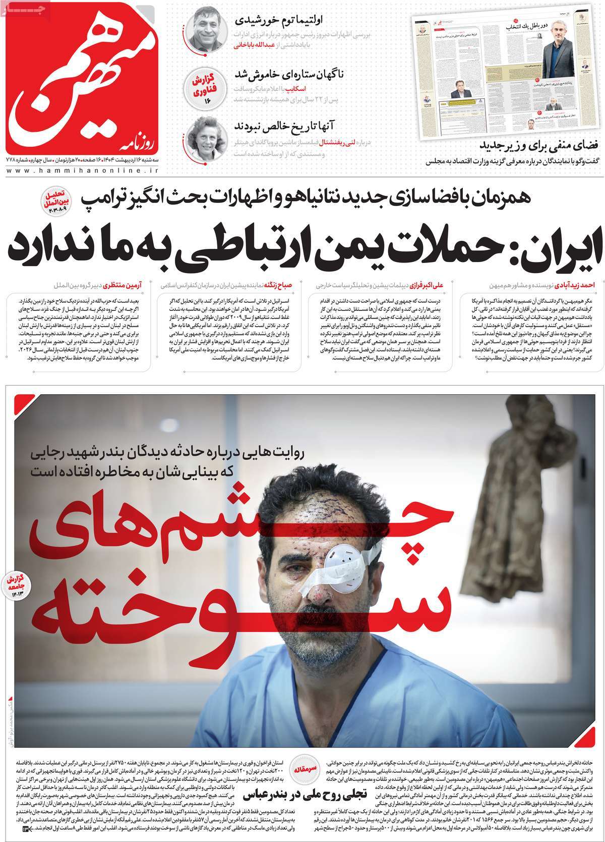 برترینها: روزنامه هممیهن در گزارشی به بررسی آسیبدیدگان انفجار بندر شهید رجایی از ناحیه چشم پرداخته است.