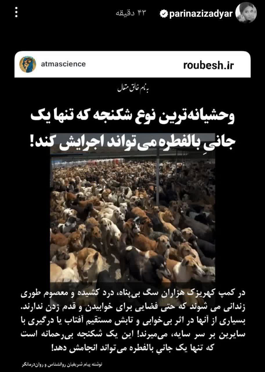 روزنو :پریناز ایزدیار، در جدیدترین استوری خود، به وضعیت بیرحمانه نگهداری از سگها در کمپ کهریزک واکنشی تند نشان داد.