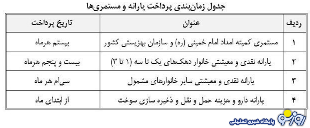 جدول اعلامی پرداخت مستمری مددجویان بهزیستی و کمیته امداد
