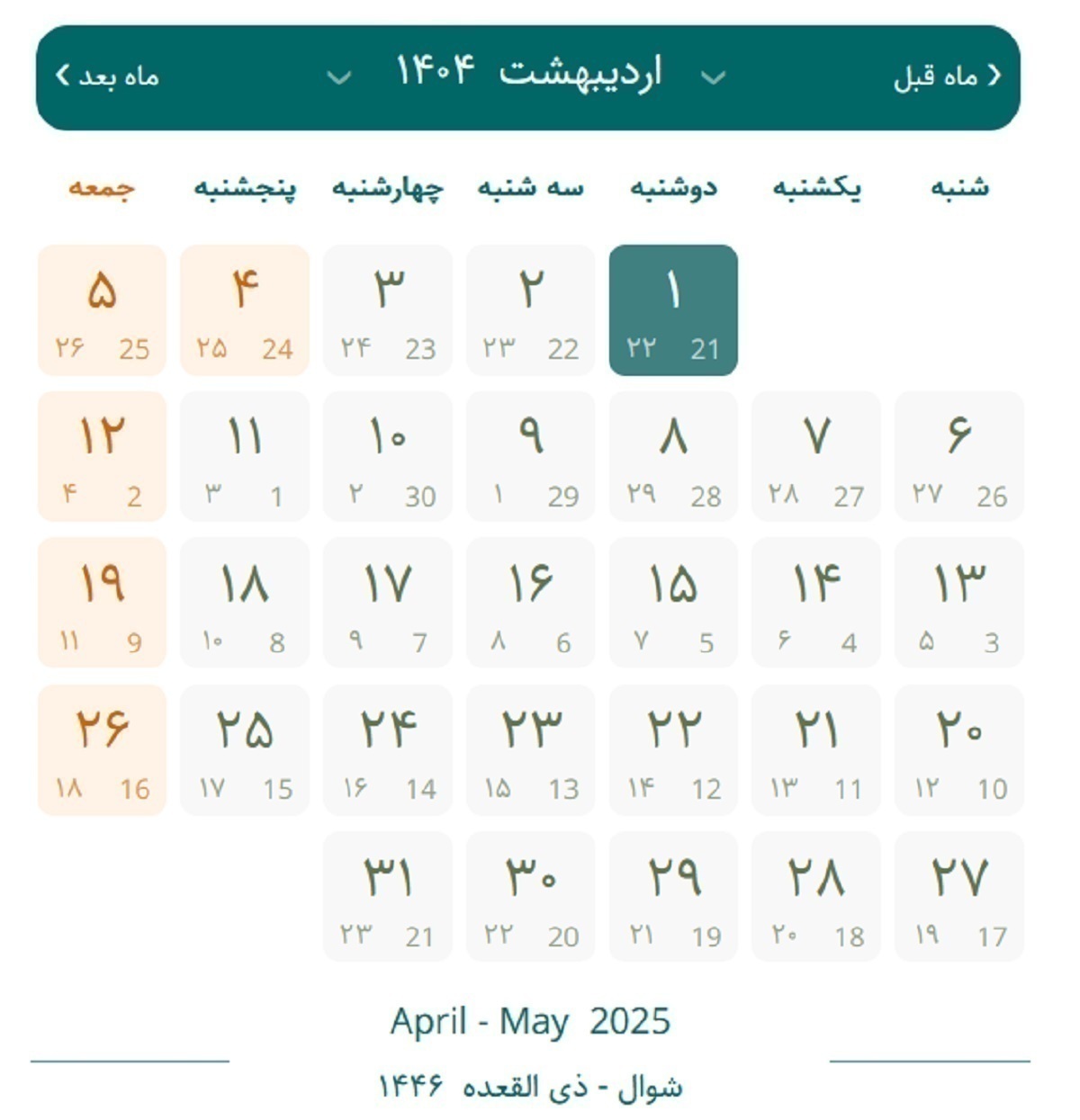 روزنو :امروز یکشنبه ۲۱ اردیبهشت ۱۴۰۴ برابر با ۱۳ ذی القعده ۱۴۴۶ هجری قمری و ۱۱ می ۲۰۲۵ میلادی است.