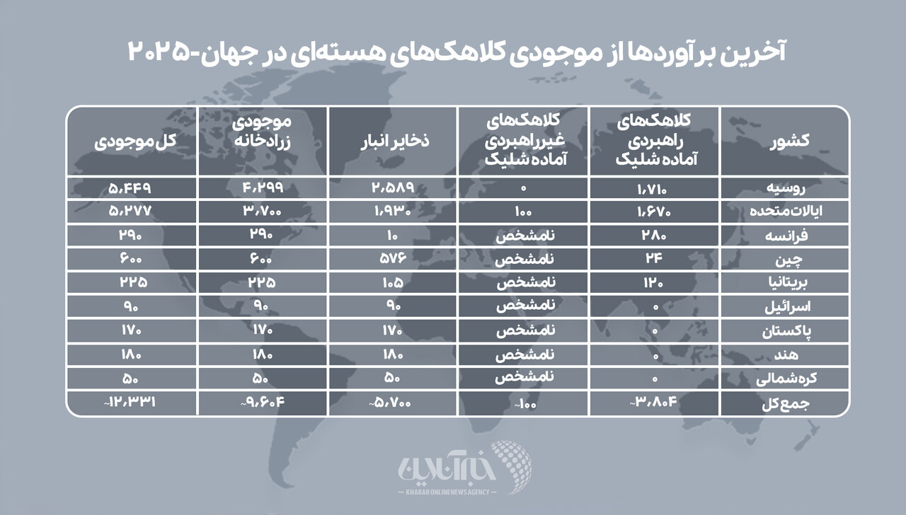 خبرآنلاین: با وجود گذشت بیش از سه دهه از پایان جنگ سرد، همچنان جهان روی انبار باروت است. اکنون مجموع تعداد کلاهکهای هستهای در جهان همچنان در سطح بسیار بالایی باقی مانده است. تا آغاز سال ۲۰۲۵، تنها ۹ کشور در مجموع حدود ۱۲٬۳۳۱ کلاهک هستهای در اختیار داشتند. ایالات متحده و روسیه مالک حدود ۸۸ درصد از کل زرادخانه جهانی و ۸۴ درصد از کلاهکهای ذخیرهشده در زرادخانههای نظامی هستند. در حالیکه هیچکدام از سایر کشورهای دارای سلاح هستهای بیش از چند صد کلاهک را برای تأمین امنیت ملی خود ضروری نمیدانند، بسیاری از آنها در حال افزایش ذخایر خود هستند.