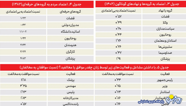 مقایسه نتایج جدولهای ۳ و ۴ نشان میدهد که در پیمایش ارزشها و نگرشهای سال ۱۳۸۲، اعتماد به پزشکان پس از آموزگاران و استادان دانشگاه، همچنان بالاترین است. دو دهه بعد و در سال ۱۴۰۲، اعتماد به همه گروههای حرفهای کمتر شده است، البته کاهش اعتماد به پزشکان به شدت دیگران نبوده است. مسئله سلامت و بیماری بسیار مهم است؛ حتی با وجود شرایط عمومی کشور، این مسئله به گونهای است که همچنان موجب یک دغدغه جدی است.