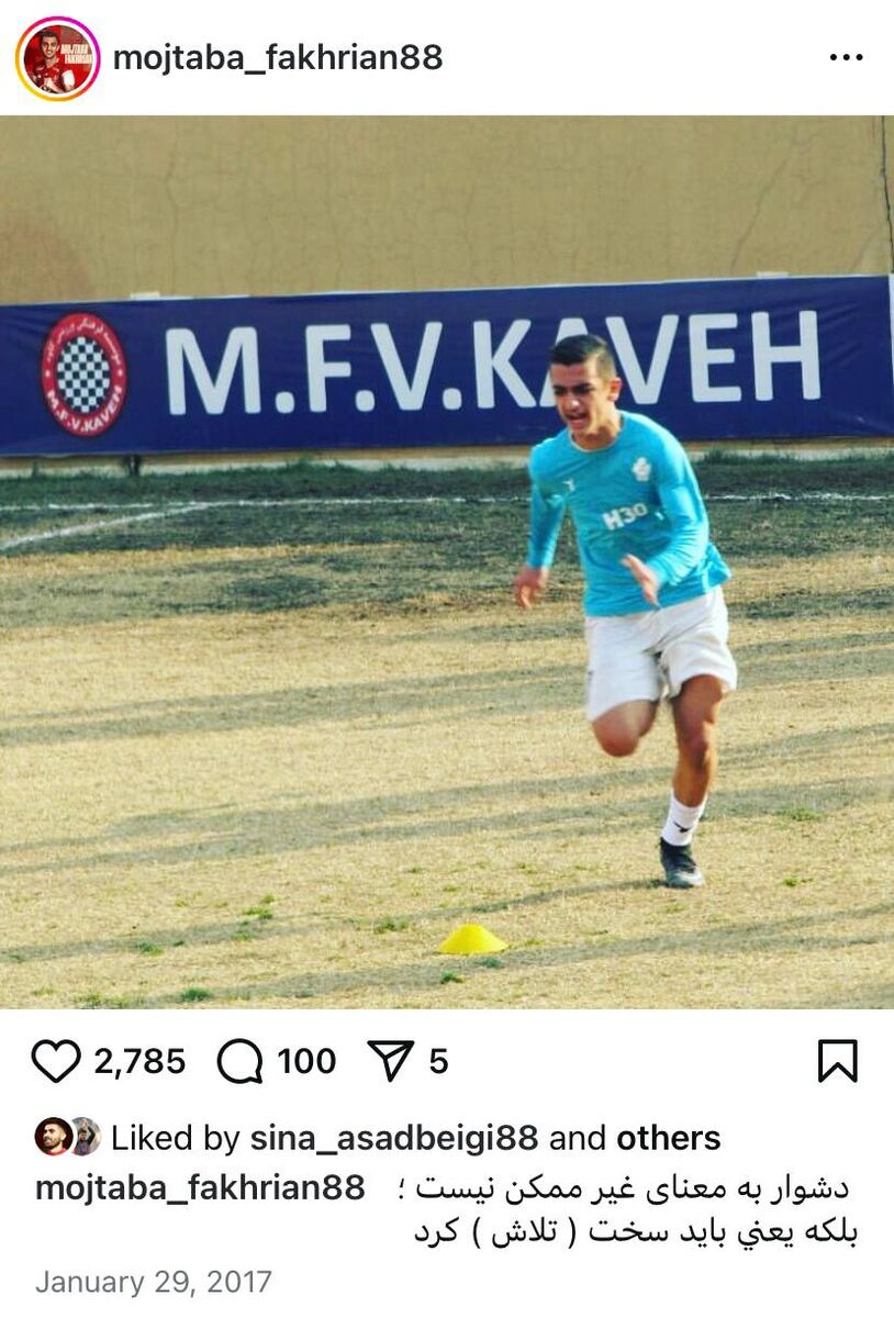دقیقا ۸ سال و سه ماه و ۱۸ روز قبل فخریان این پست را منتشر کرد و در کپشن این پست نوشت: دشوار به معنای غیرممکن نیست؛ بلکه یعنی باید سخت (تلاش) کرد. حالا فخریان بعد از چند سال تلاش و پیمودن پله های ترقی به یکی از اهداف بزرگ خود در فوتبال رسیده است. آری حق با مجتبی فخریان بود؛ باید سخت تلاش کرد!