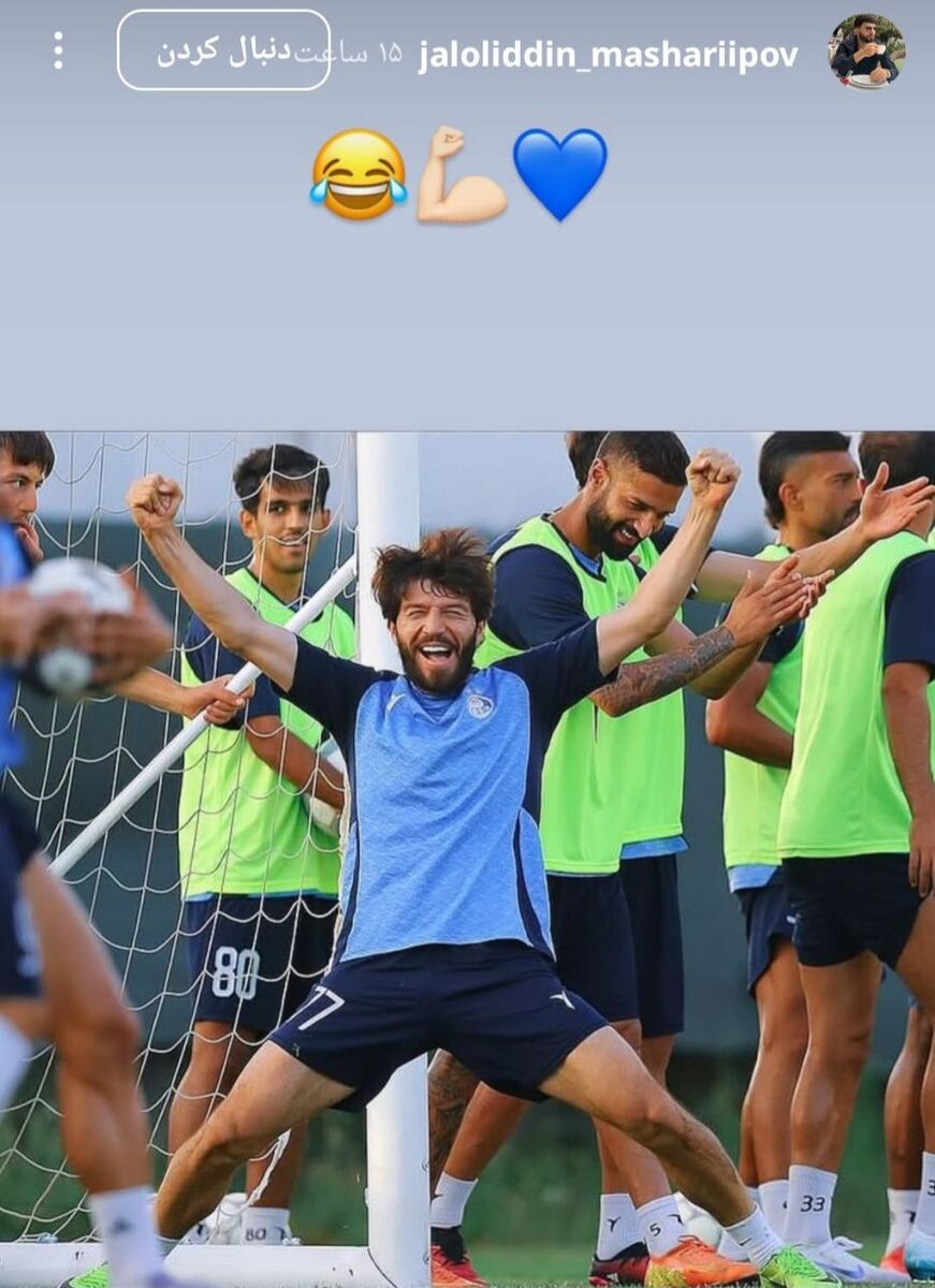 جلال الدین ماشاریپوف ستاره ازبکستانی استقلال روز پنجشنبه عکسی از خود هنگام شادی در جریان تمرین این تیم را منتشر کرد که نشان میدهد حسابی روی فرم قرار داشته و میخواهد فصل را به بهترین شکل ممکن با آبی پوشان پایتخت تمام کند. البته ماشاریپوف بلافاصله پس از پایان کارش در این فصل با استقلال، باید آماده همراهی تیم ملی ازبکستان در پیکارهای انتخابی جام جهانی شود.