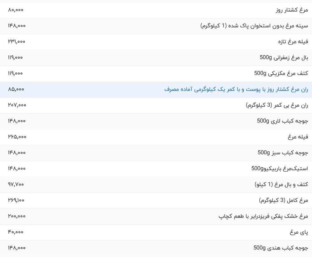 قیمت گوشت مرغ، امروز ۴ خرداد ۱۴۰۴ شامل ران مرغ، مرغ زنده، مرغ بدون استخوان، فیله مرغ، پا مرغ، مرغ کشتار روز، ران مرغ با پوست، مرغ ترش و مرغ سبز اعلام شد..