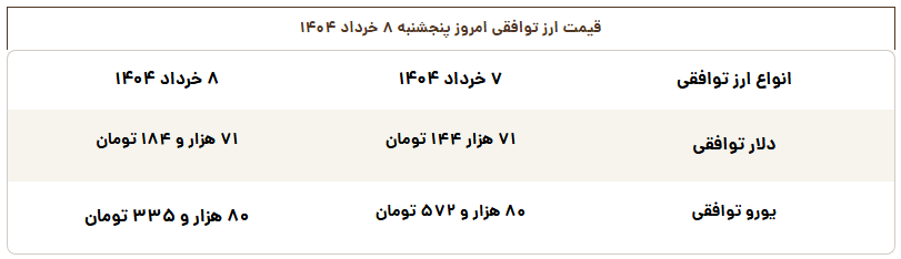 از سوی دیگر، یورو توافقی امروز با قیمت 80 هزار و 335 هزار تومان به فروش میرسد. روز گذشته قیمت یورو توافقی برابر با 80 هزار و 572 تومان بود.