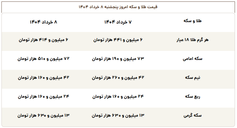 طلا 18 عیار امروز پنجشنبه 8 خرداد 1404 با قیمت 6 میلیون و 414 هزار تومان به ازای هر گرم به فروش میرسد.