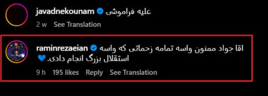 کامنت رامین رضاییان زیر پست جواد نکونام جنجالی شد