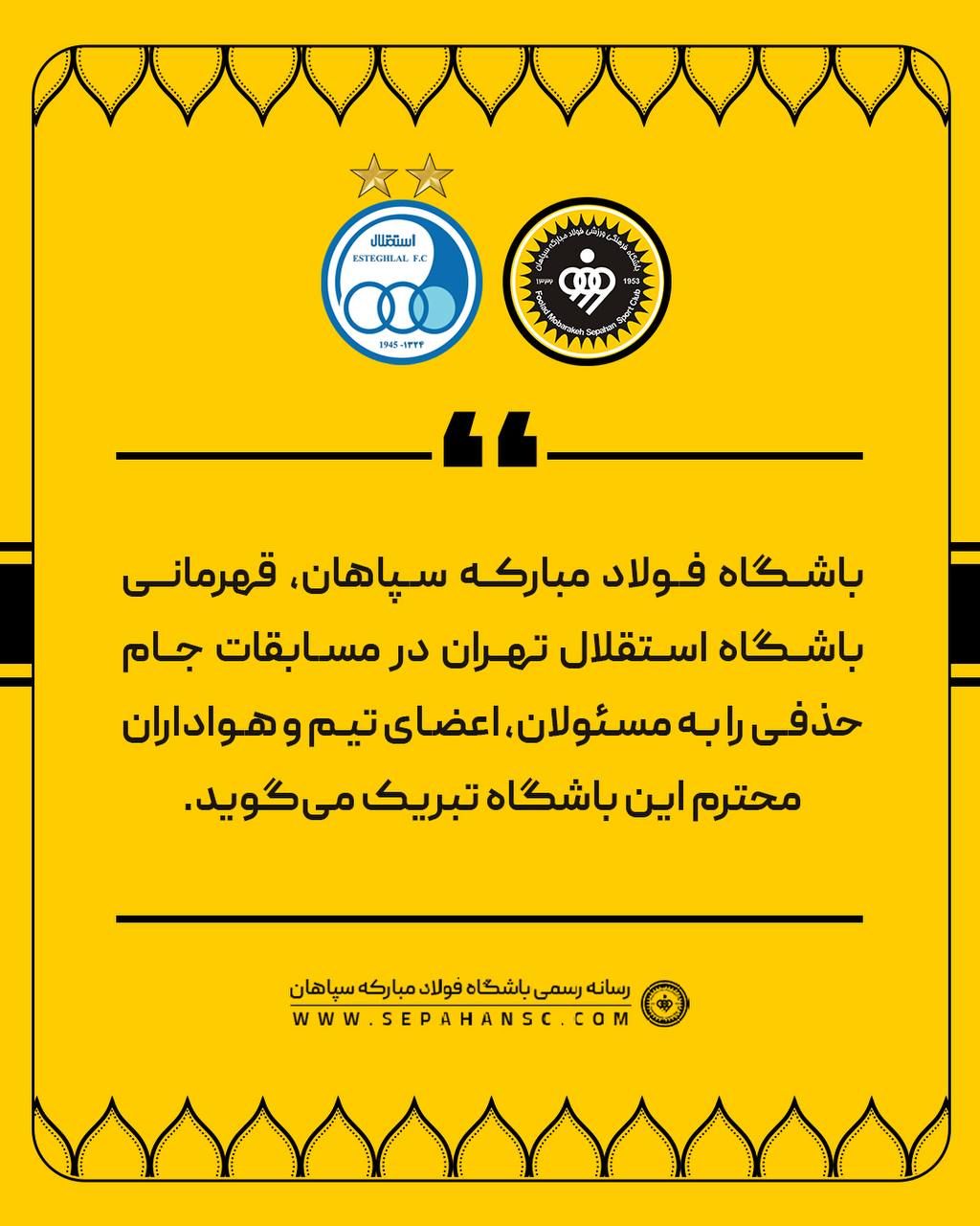 باشگاه سپاهان اصفهان، قهرمان فصل گذشته جام حذفی، با انتشار پیامی رسمی، موفقیت تیم استقلال تهران در جام حذفی را تبریک گفت. پیش از این، باشگاه استقلال نیز به قهرمانی سپاهان در مسابقات سوپرجام واکنش نشان داده و تبریک خود را اعلام کرده بود.