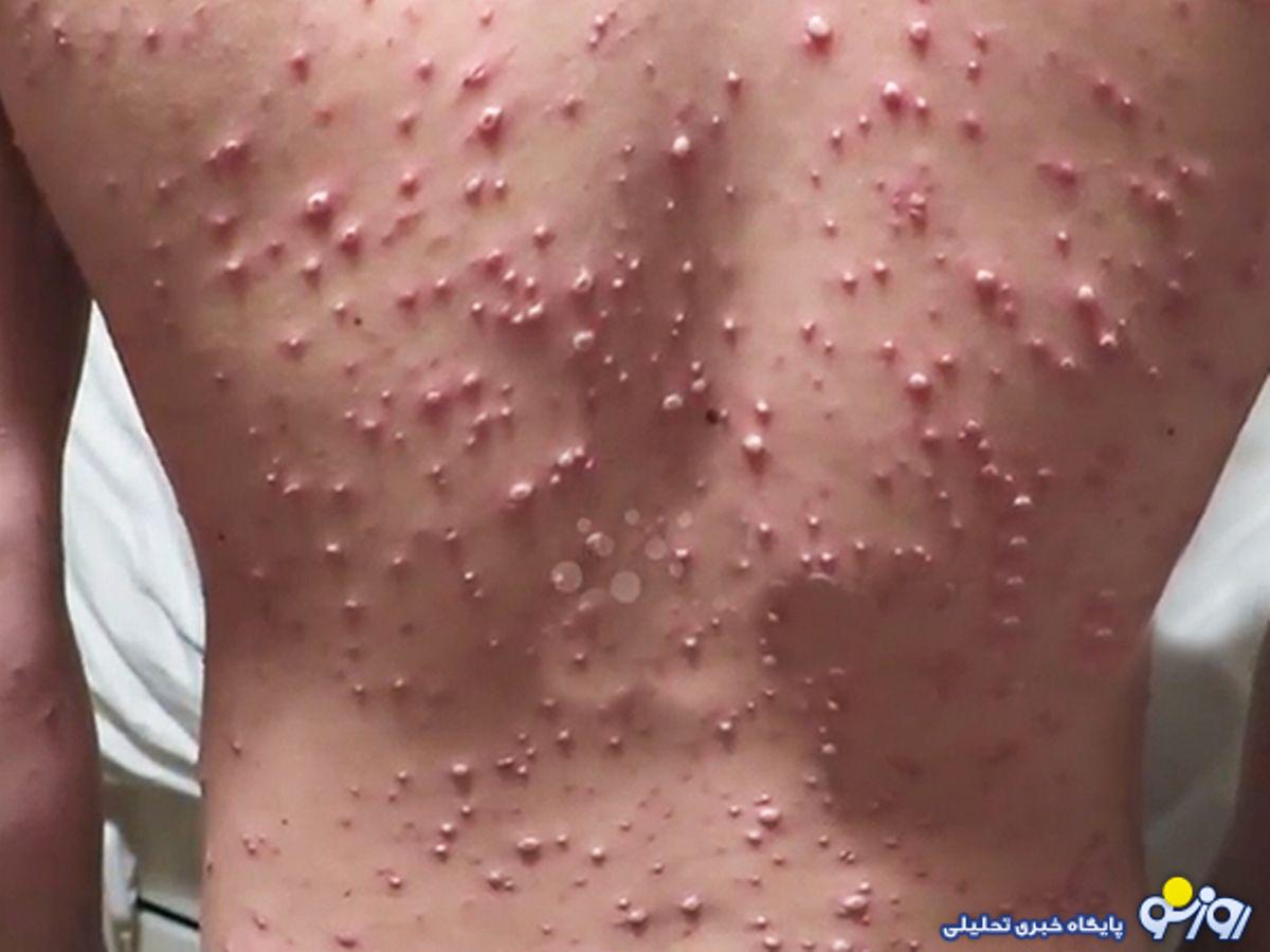 · دانههای قرمز پوستی که کمکم به تاولهای خارشدار بدل میشوند. این دانهها به طور معمول ابتدا روی بدن، سر و صورت دیده میشوند و سپس در دست و پا ظاهر میشوند.